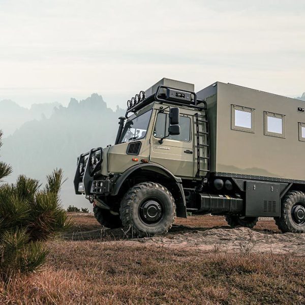 With a gross vehicle weight of 14,000 kg, the K5 series is equipped with a 290L fuel tank and a 60L urea tank, making it ideal for long-distance travel. The drive axle reduction ratio of i=4.413, 10.7T displacement, 360 HP maximum power, and 1800 N.m maximum torque ensure powerful performance in any terrain. Advanced features include electronic rearview mirrors, Mercedes-Benz original electronic indirect vision assistance, Michelin 14.00R20 XZL ‘+’ series off-road tires, a backlit three-pointed star emblem, and pneumatic lift suspension seats with ventilation and heating, providing unmatched comfort and safety. The vehicle comfortably accommodates up to 6 people, making it perfect for family adventures or group travel.