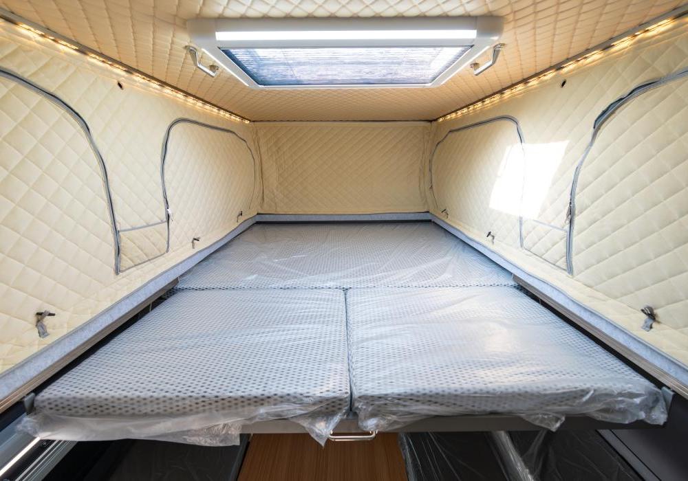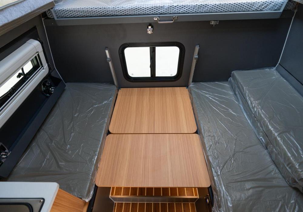 - Telescopic Bunk Beds: Includes an upper bunk measuring 2000mm × (1450mm–1700mm) and folding bench seats that convert into a bed, accommodating up to 4 people.